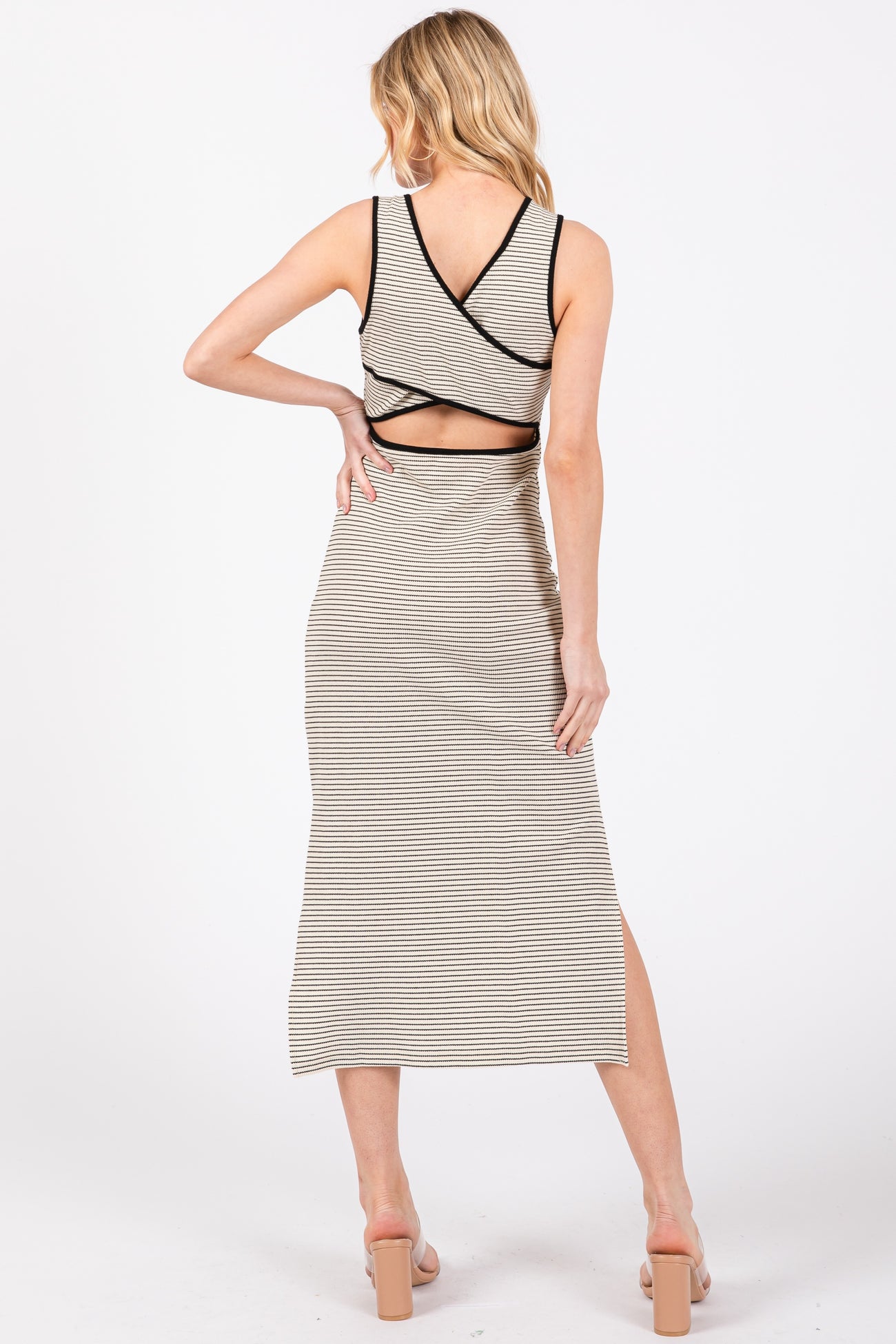 Cream Striped Cutout Cross Back Side Slit Midi Dress