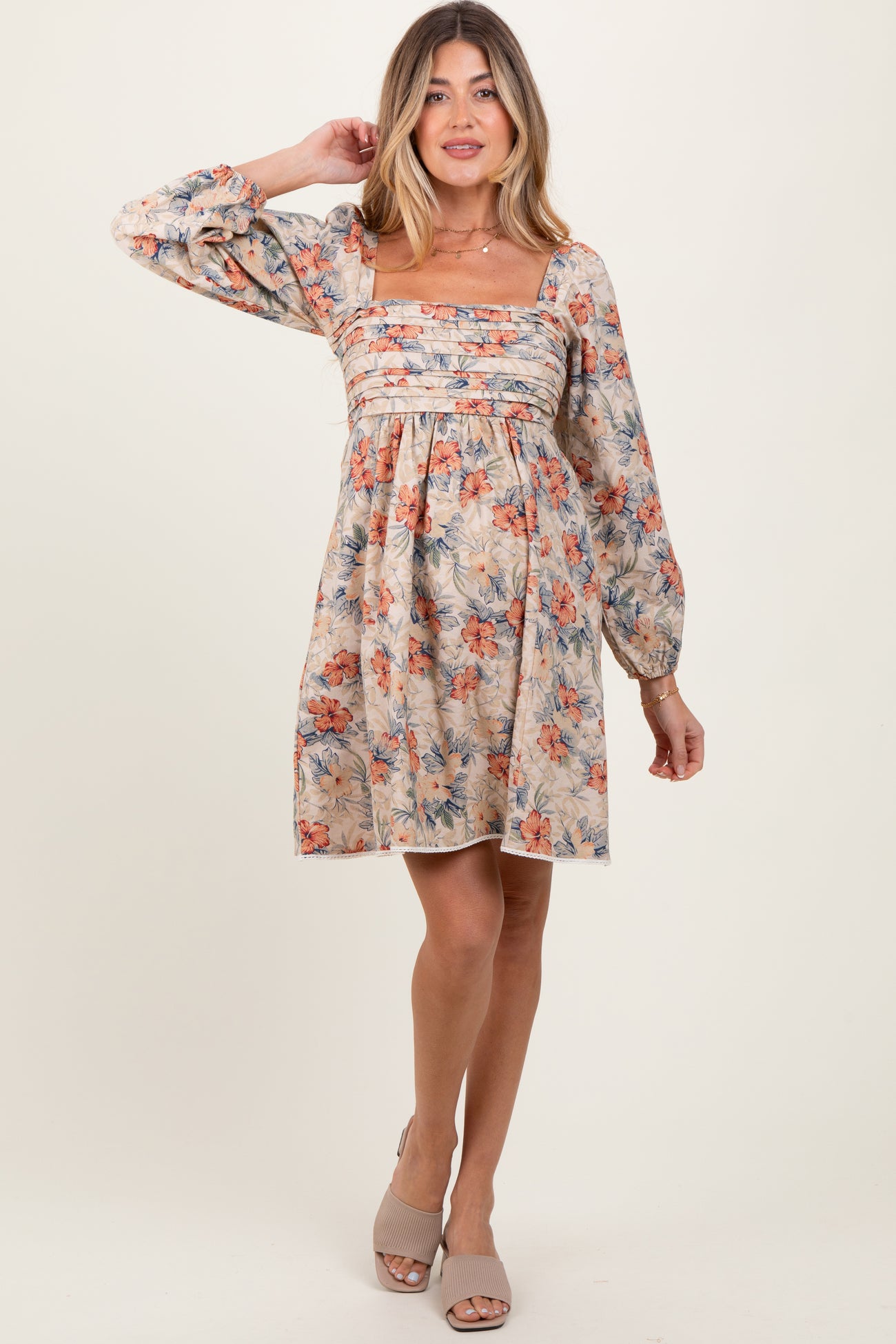 Cream Tropical Floral Pleated Bodice Maternity Dress
