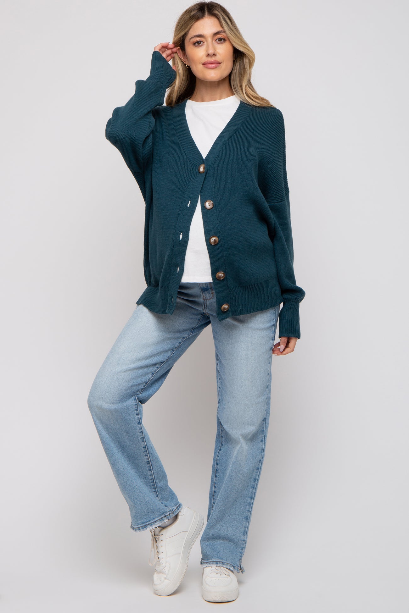 Dark Teal Basic Ribbed Maternity Cardigan Sweater