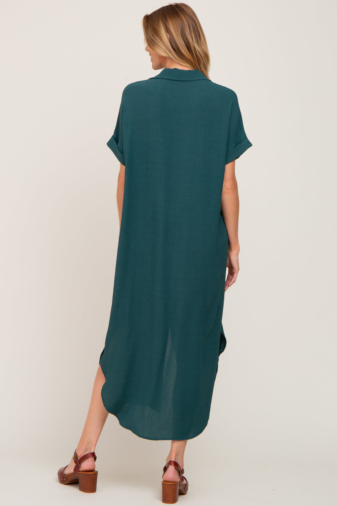 Details A solid maxi dress featuring functioning front buttons, a collar, two front pockets, cuffed short dolman sleeves, and a hi-low rounded hemline. Content + Care