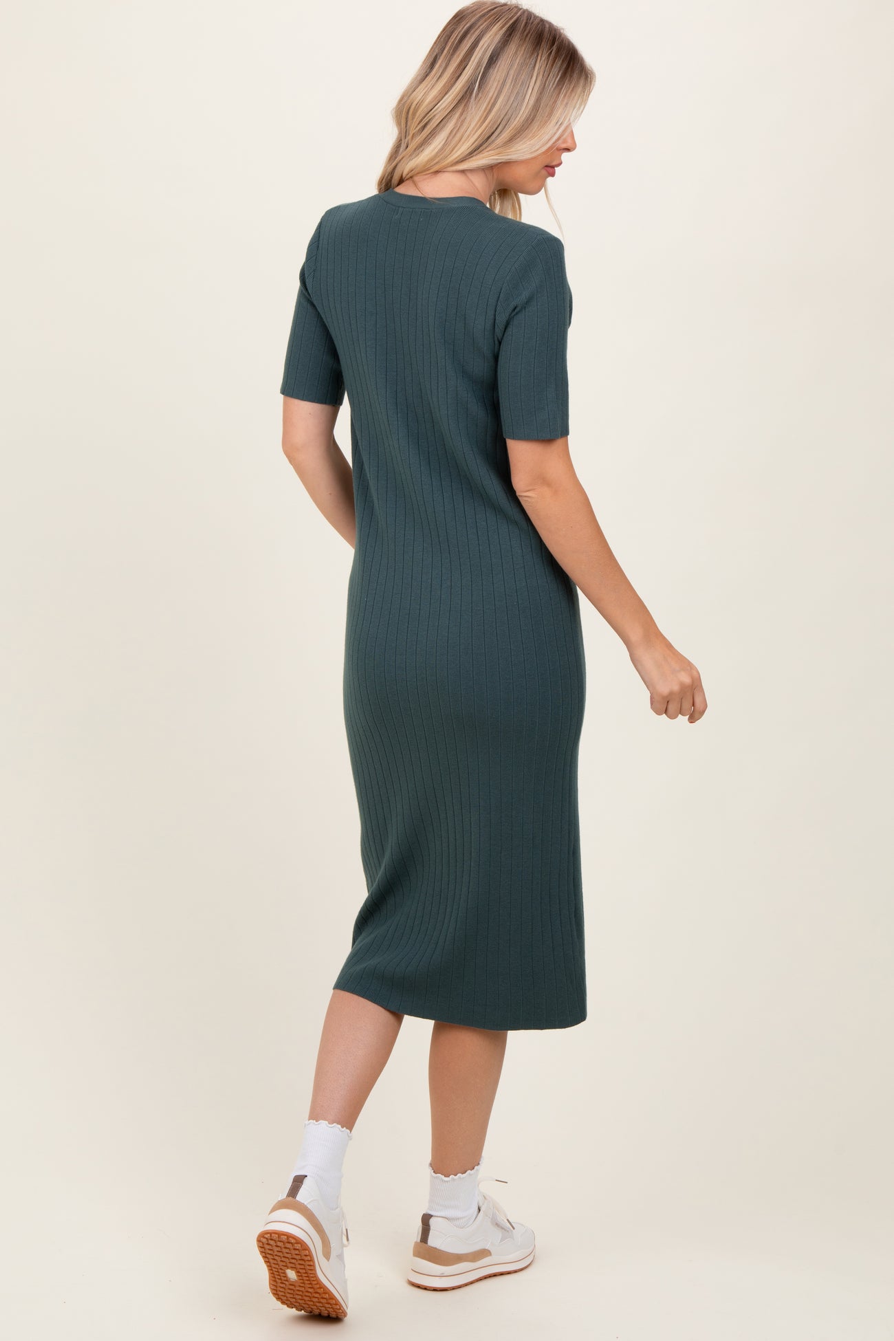 Step into effortless style with our Forest Green Button Down Sweater Midi Dress. Crafted from soft, ribbed knit fabric, this dress offers a flattering, body-hugging fit perfect for any occasion. Featuring a chic V-neckline, short sleeves, and a full button-down front, it's as versatile as it is comfortable. The midi length adds a touch of sophistication, while the subtle slit at the hem enhances movement. Pair it with sneakers for a casual day out or dress it up with heels for an elegant evening look. Elevate your wardrobe with this must-have seasonal staple!