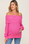 A solid off shoulder sweater with a foldover neckline in a chunky popcorn knit material.