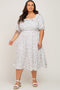 A solid chiffon maternity dress with metallic stripes, smoked bodice, bubble sleeves. and a ruffle hem. Sleeves are semi sheer, body is lined.