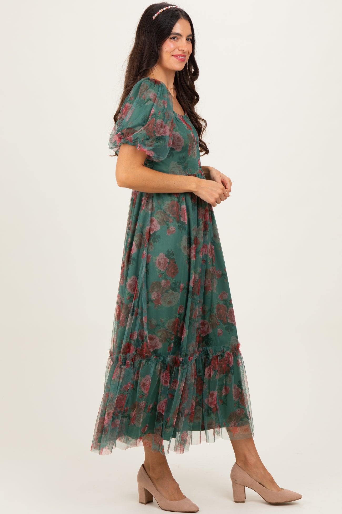 Step into elegance with our Forest Green Rose Print Tulle Overlay Midi Dress. This enchanting dress features a flattering square neckline and delicate puff sleeves, creating a romantic silhouette. The forest green base is beautifully adorned with a vintage-inspired rose print, layered with a soft tulle overlay for added dimension and grace. The midi length and ruffled hem offer a timeless, feminine look perfect for garden parties, weddings, or special evenings out. Pair with nude heels and minimal accessories to complete your effortlessly chic ensemble. Comfortable, stylish, and uniquely charming—this dress is a must-have for your wardrobe.