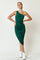 A ruched maxi dress with a one shoulder neckline, asymmetrical hem, and a side zipper closure.