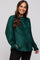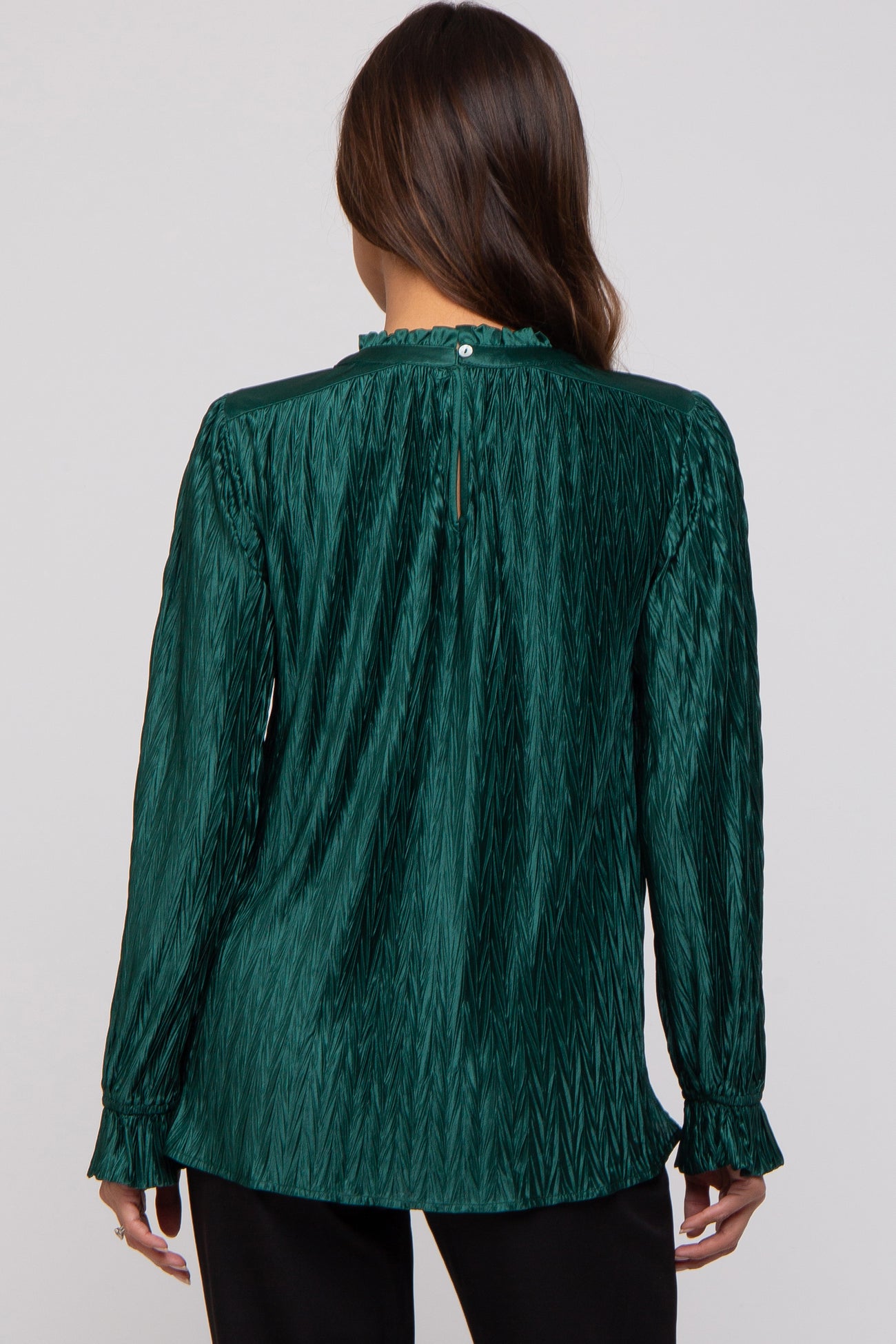 A textured maternity top featuring a ruffle accent mock neckline, long cinched sleeves, and a back keyhole button closure.