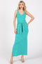 A solid hued midi dress featuring short balloon sleeves, a self-tie split neckline and a ruffle hem.
