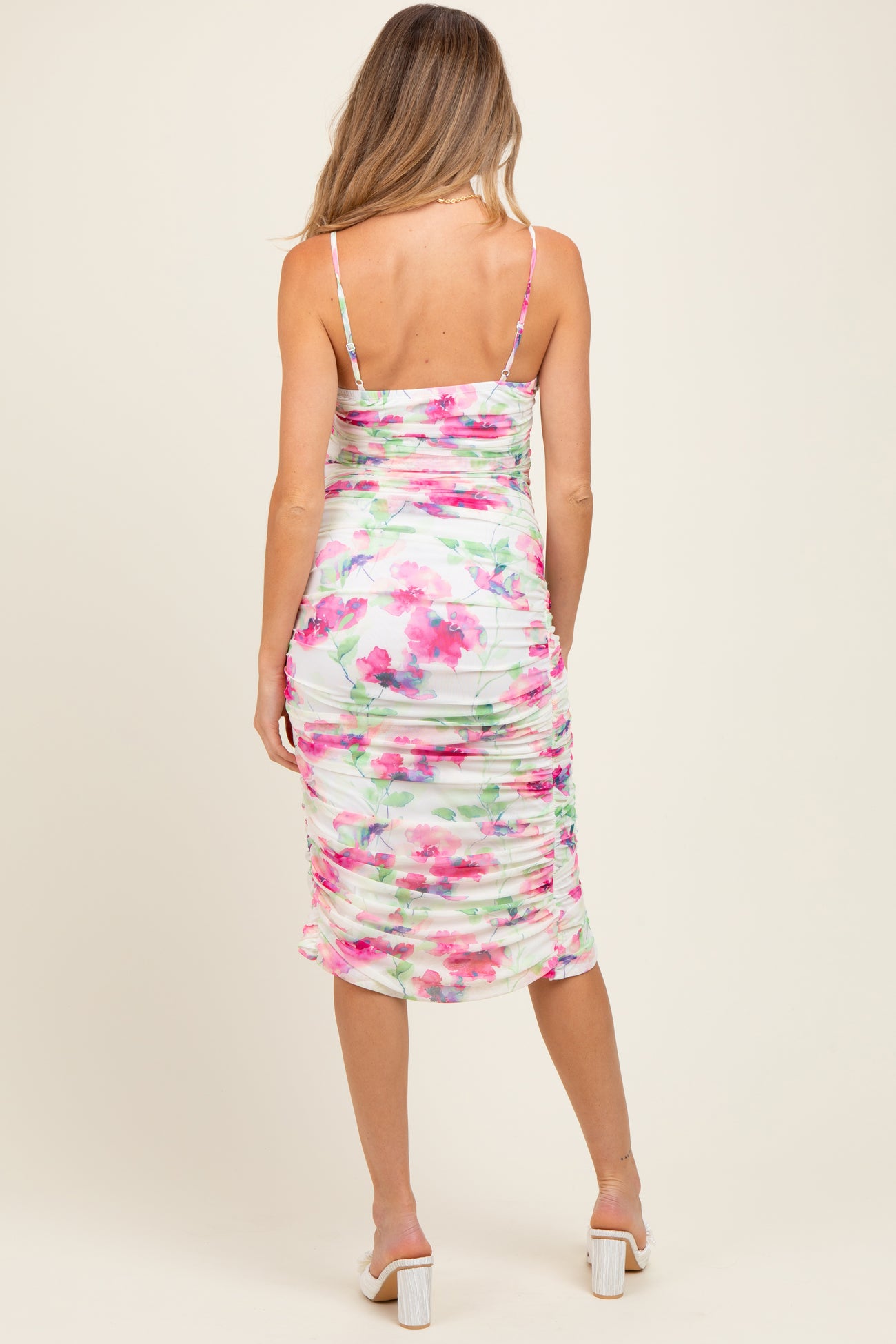 Fuchsia Floral Ruched Tulip Hem Maternity Midi Dress