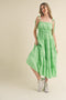 A floral print midi dress featuring a v-neckline, 3/4 length sleeves, ruffle trim at the waist and a ruffle hem.