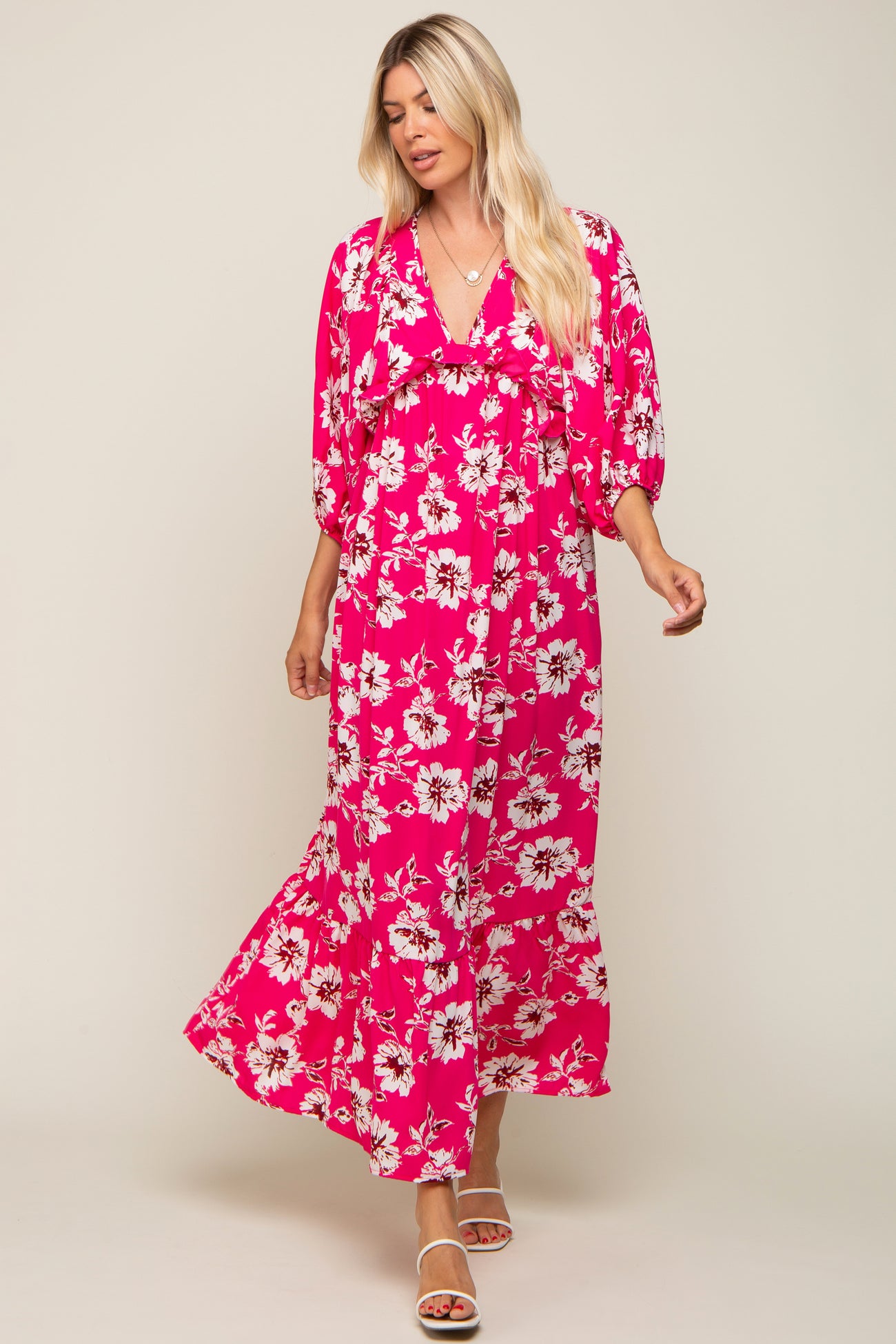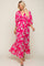 Fuchsia Floral V-Neck Dolman 3/4 Sleeve Midi Dress