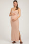 A solid knit maternity top featuring short sleeves, a front pocket and a rounded neckline.