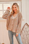A rib knit maternity maxi dress with long sleeves, a ruffle accent v-neckline, ruched sides, and a side slit with a ruffle accent.
