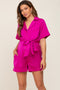A solid satin romper with a collared neckline, button down front, sash tie waist and cuffed shorts. Includes front pocket on chest and two side pockets.