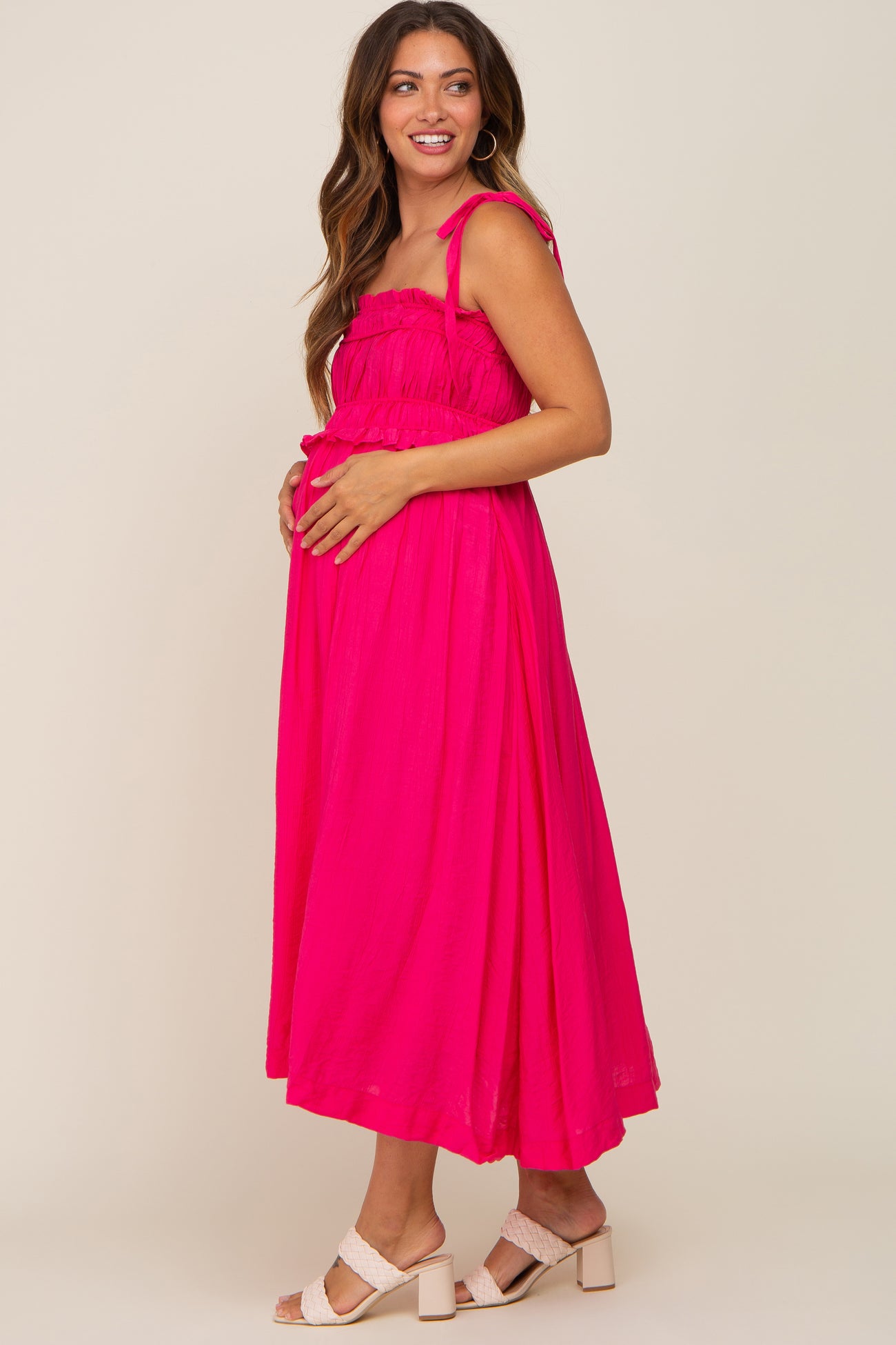 Fuchsia Shirred Shoulder Tie Maternity Midi Dress