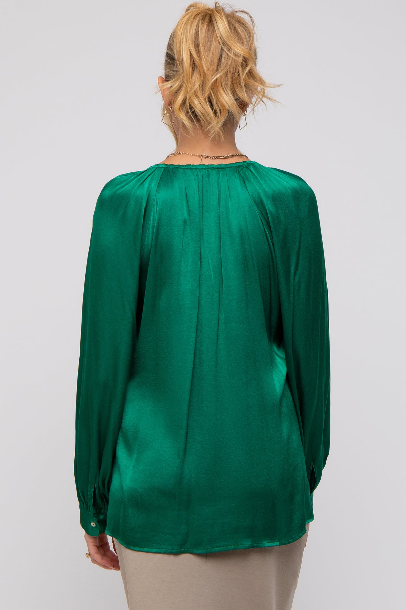 A solid hued maternity blouse featuring a button-down front, long sleeves and a v-neckline.
