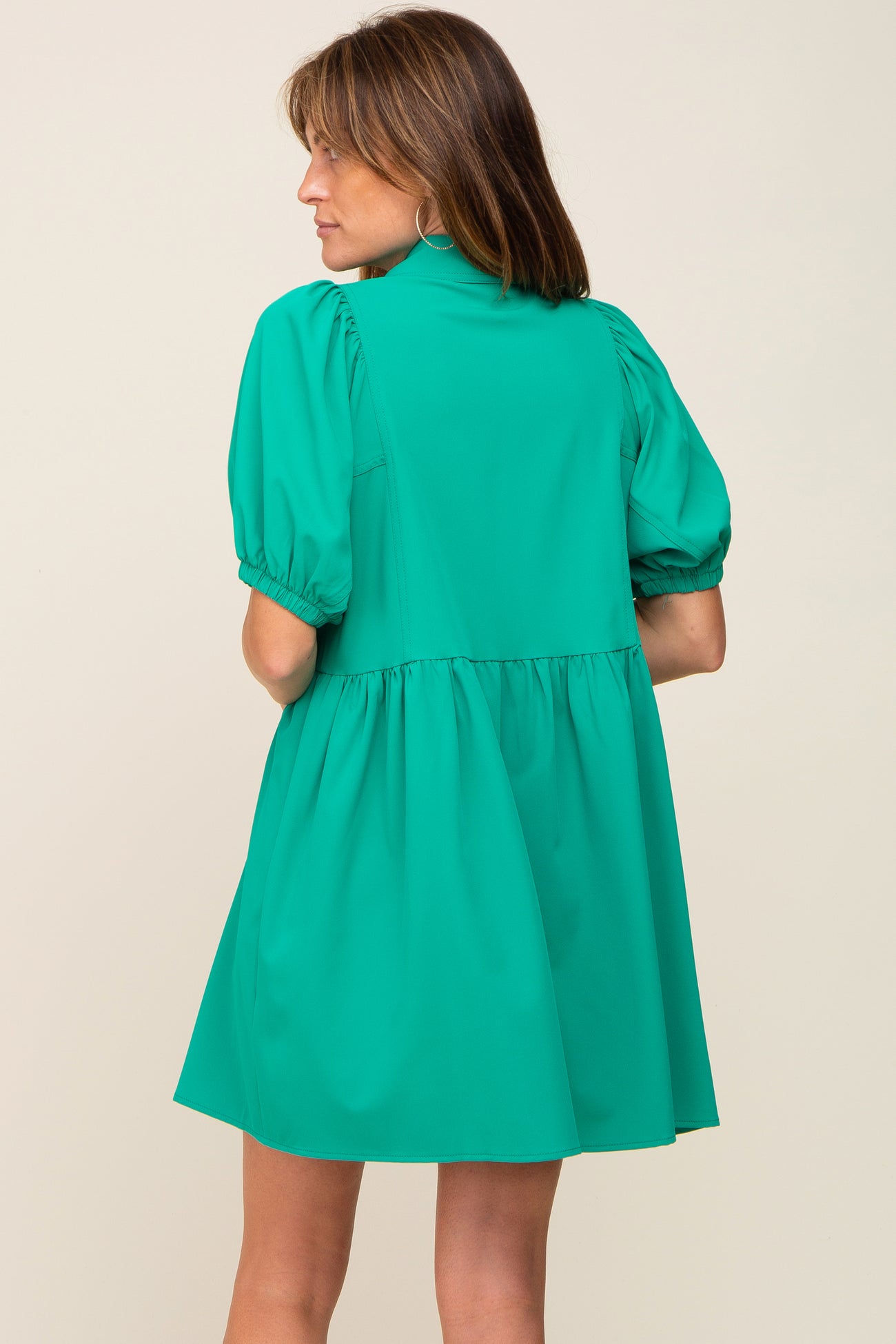 A solid button down mini dress featuring puff sleeves and snap button front closure.