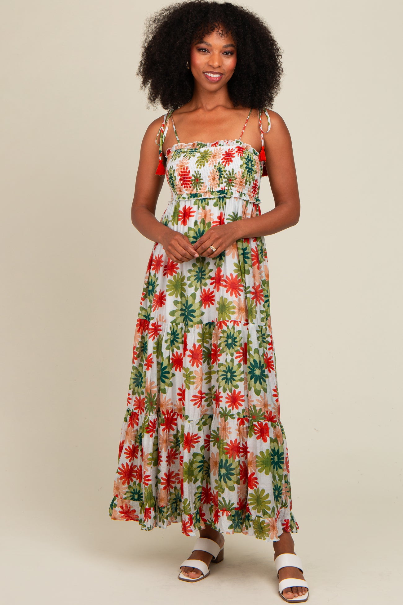 Green Floral Smocked Shoulder Tie Maxi Dress