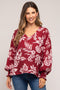 A floral satin maternity midi dress featuring a v-neckline, a wrap waist tie, long smocked accent sleeves, and an asymmetrical skirt with a flounce trim.