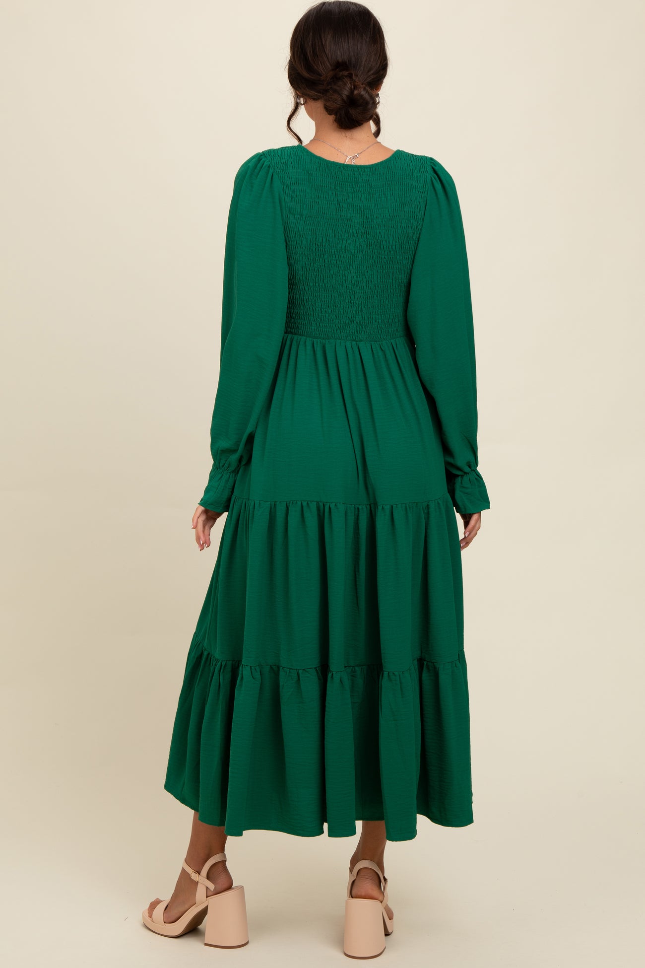 Green Smocked Tiered Long Sleeve Maxi Dress