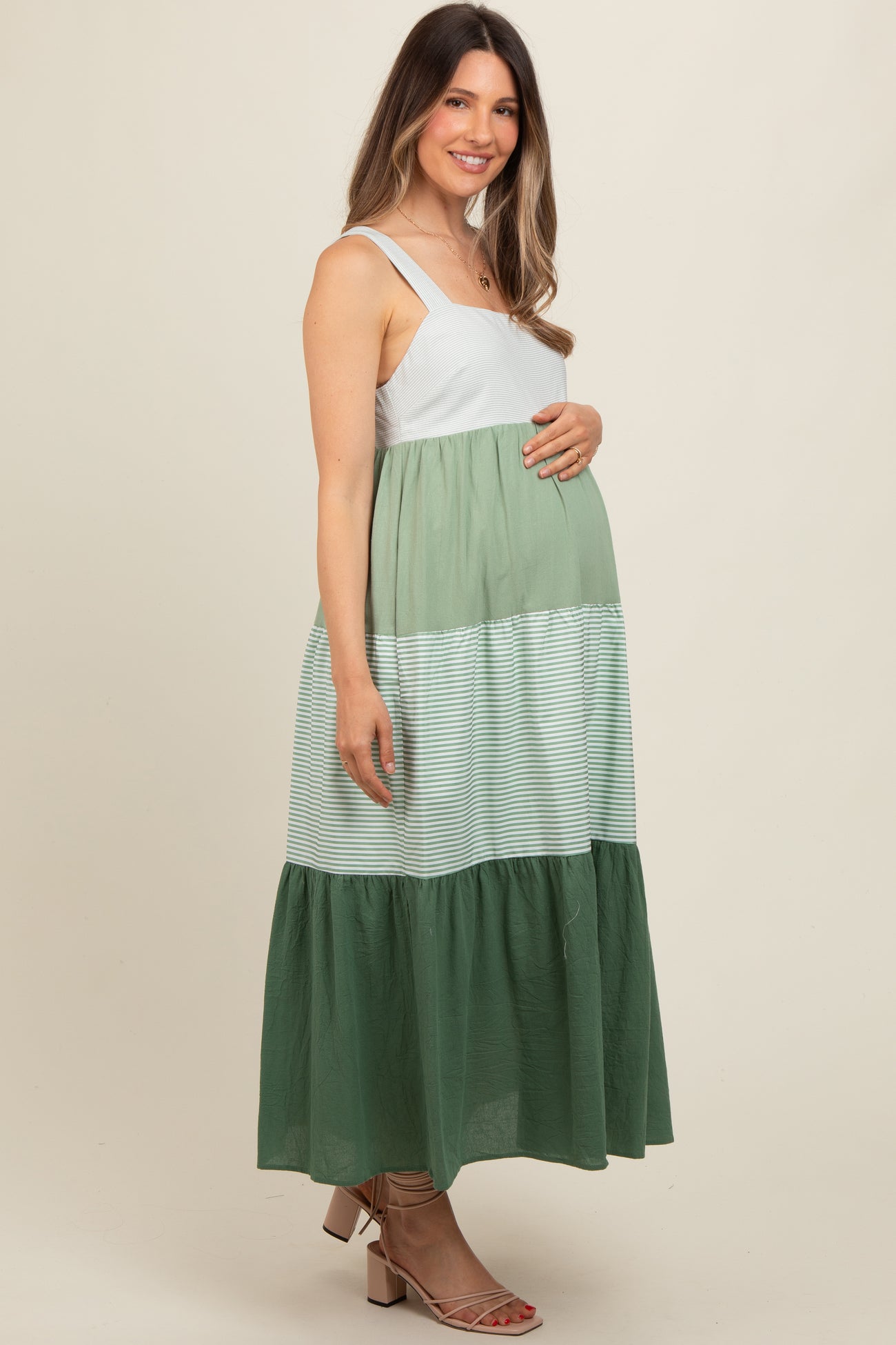 Green Striped Color Block Back Bow Maternity Midi Dress