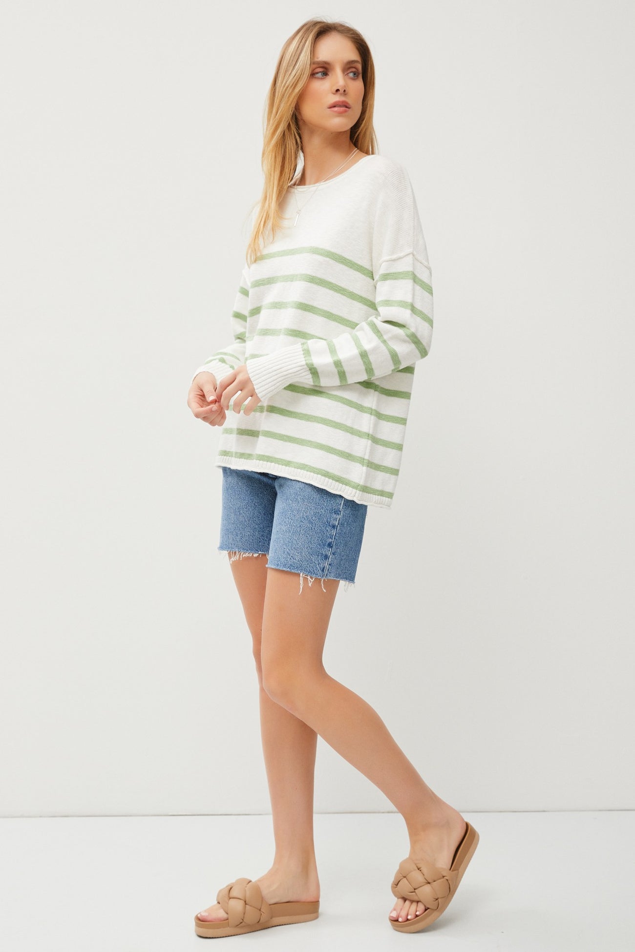 A striped sweater with ribbing on sleeves, and a boat neckline.