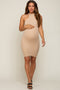 Details A textured knit fitted dress featuring a halter neckline and fully lined. Content + Care