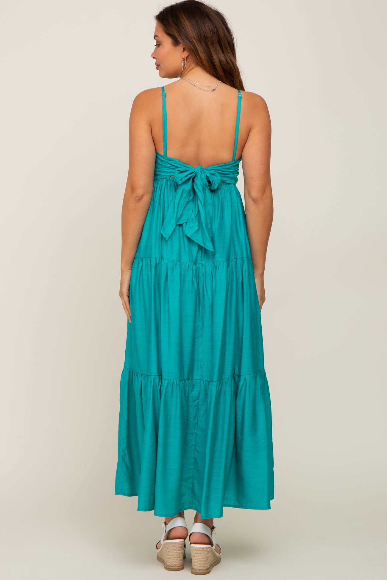 A solid maternity maxi dress with adjustable straps. Features tiered body and self tie cut out back detail.