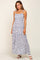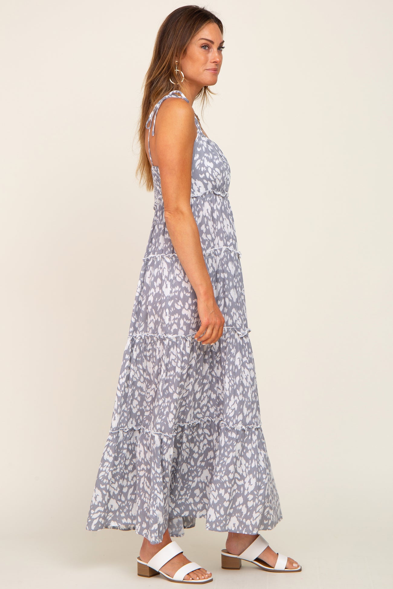 A printed maxi dress with smocked back, adjustable tie straps, ruffle trim accents and tiered body.