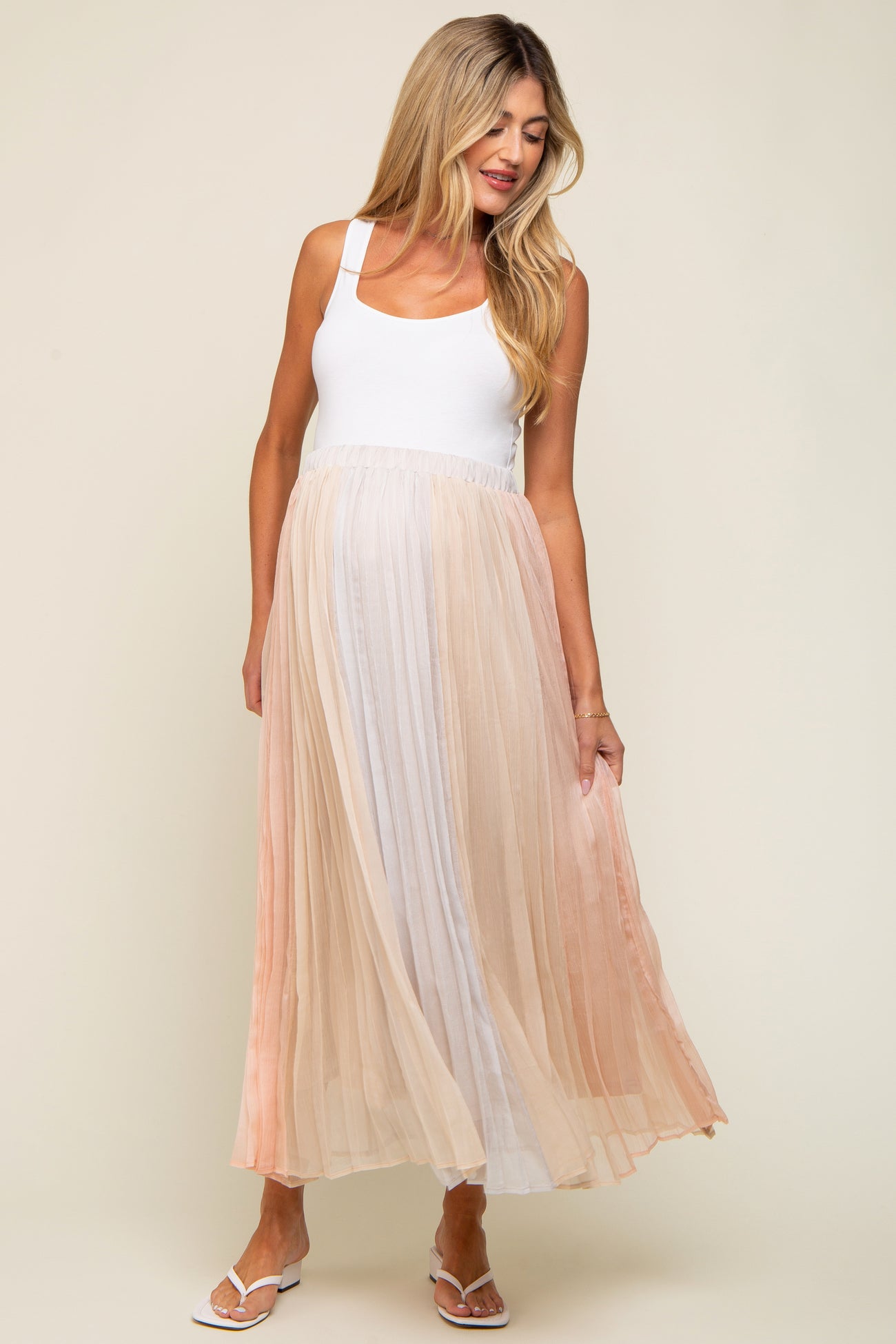 A pastel colorblocked pleated maternity maxi skirt featuring an elastic waistband and double lining.