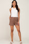 A solid short sleeve maxi dress with a deep v-neckline, ruffle accent sleeves, button down closure in front and tie accent in back. Skirt is partially lined. Pocketed.