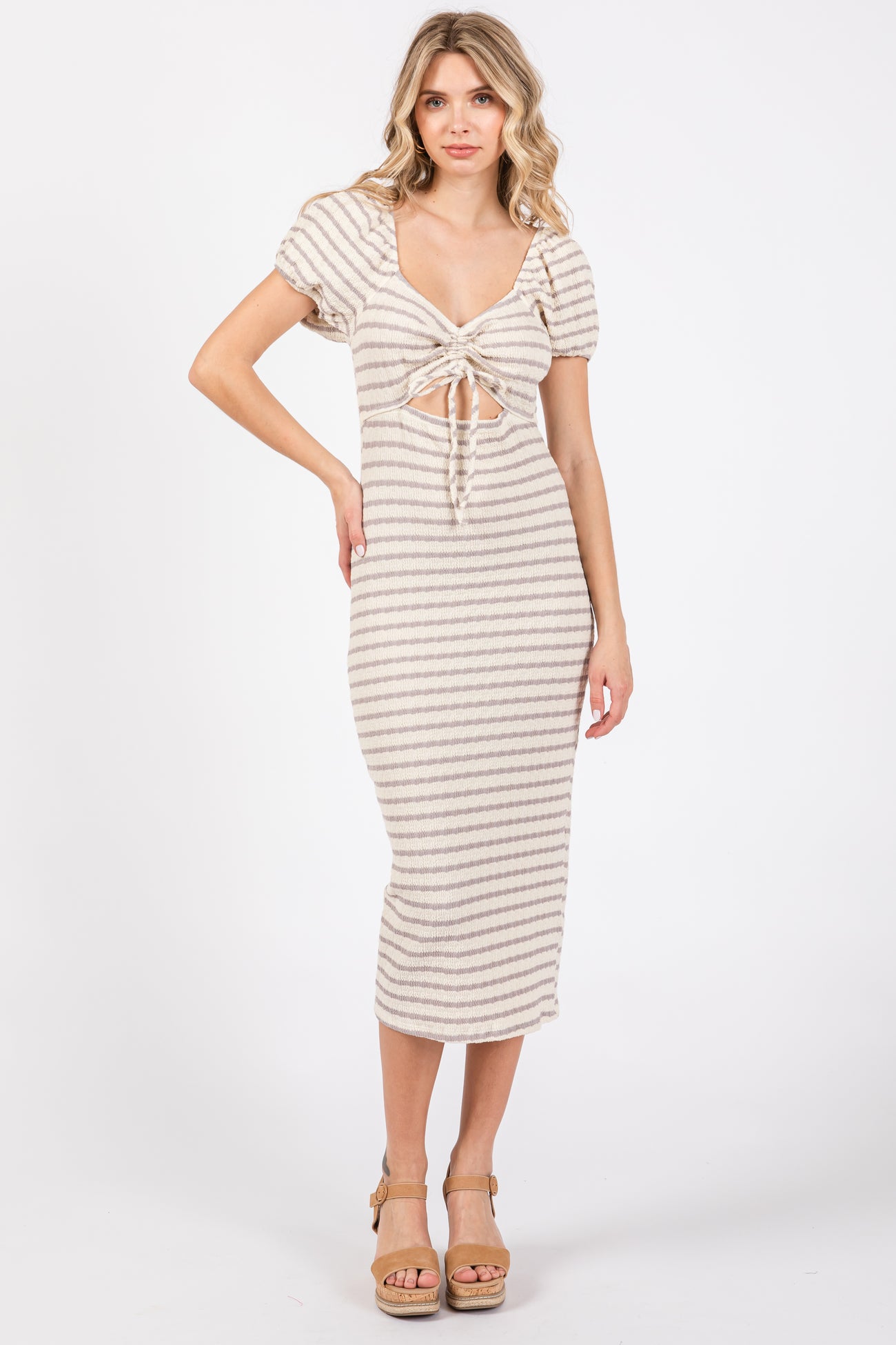 A textured stripe knit maternity midi dress featuring a v-neckline, an adjustable ruched drawstring at the bust, a front cutout and short sleeves.