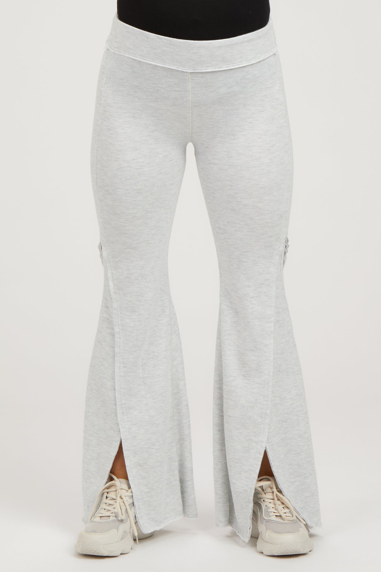 A pair of terry lounge pants featuring flare legs, front slits and a raw hem.
