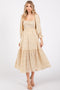 A solid fitted long sleeve dress with side ruching and wrap hem.