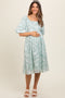 An animal print maternity top featuring short ruffle sleeves, a tiered body, a rounded neckline and a back keyhole cutout with a button closure.