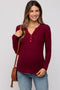 A basic maternity top featuring long raglan sleeves and a rounded neckline. Rolled accents along the neckline, sleeves, and bottom hem.