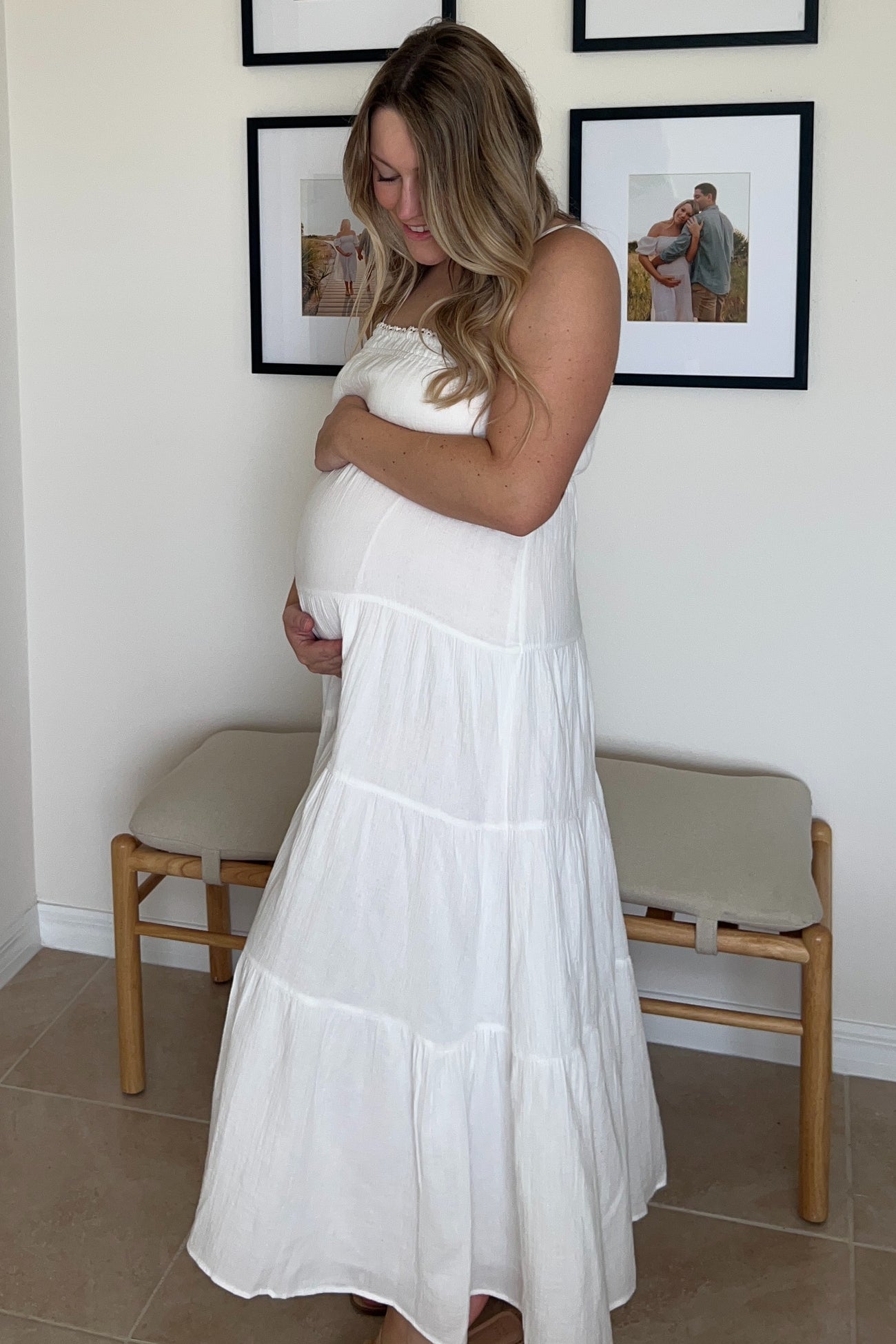 Embrace effortless style and comfort with our Ivory Crochet Trim Tiered Maternity Maxi Dress. Designed with soft, breathable fabric, this lightweight maxi features delicate crochet trim along the neckline and adjustable spaghetti straps for a perfect fit as your belly grows. The tiered silhouette flows gracefully, providing ample room and a flattering shape throughout pregnancy. Whether you're strolling on sunny days or enjoying a casual gathering, this dress combines elegance and ease to keep you cool and chic. A versatile maternity must-have for your seasonal wardrobe!