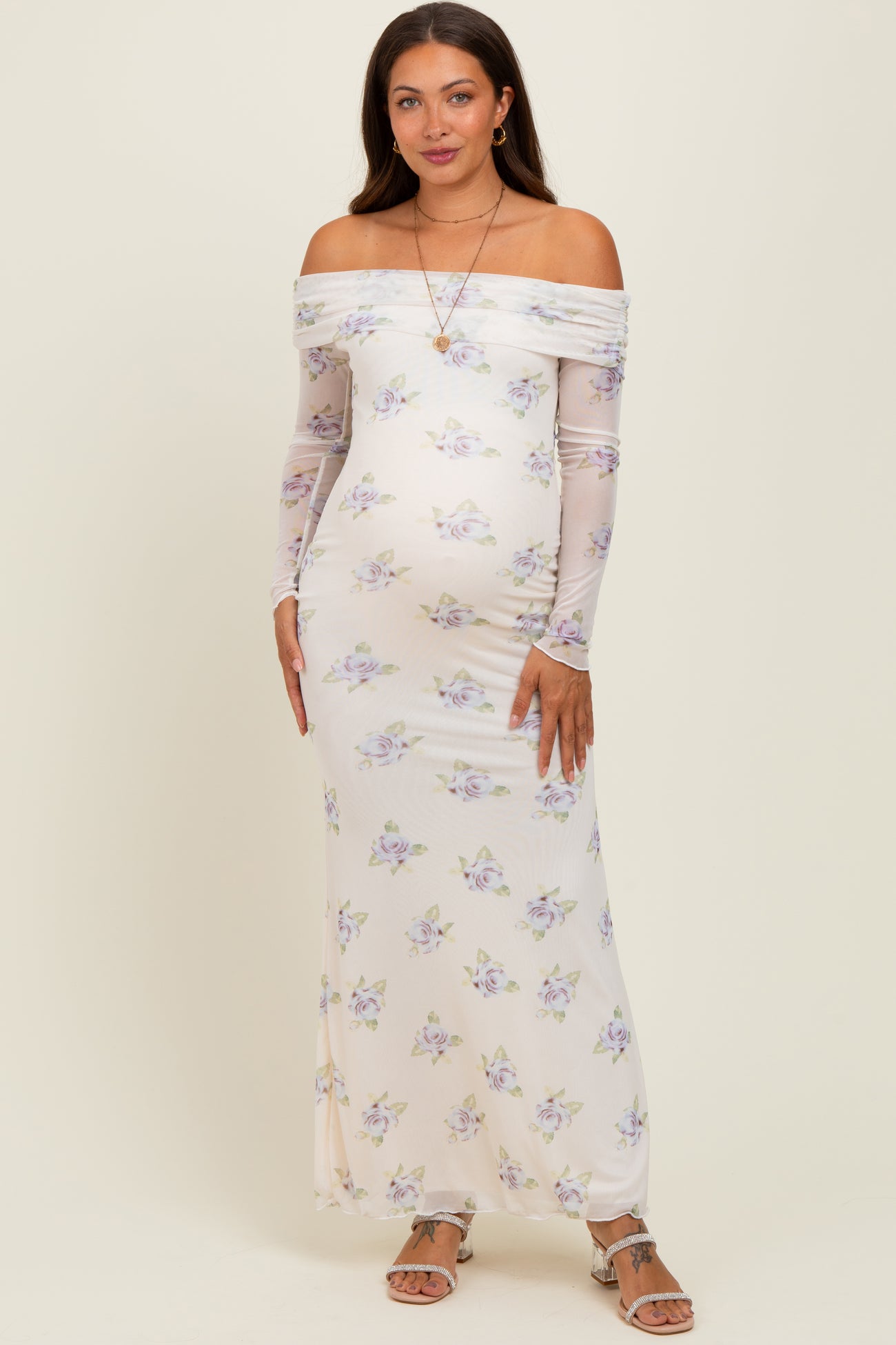 Ivory Floral Mesh Off Shoulder Foldover Maternity Maxi Dress