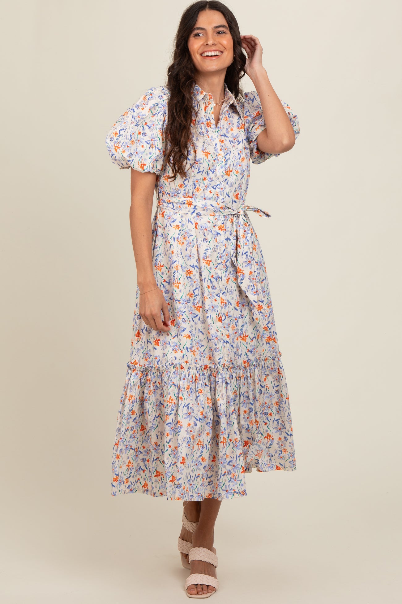 Ivory Floral Puff Sleeve Button Down Midi Dress