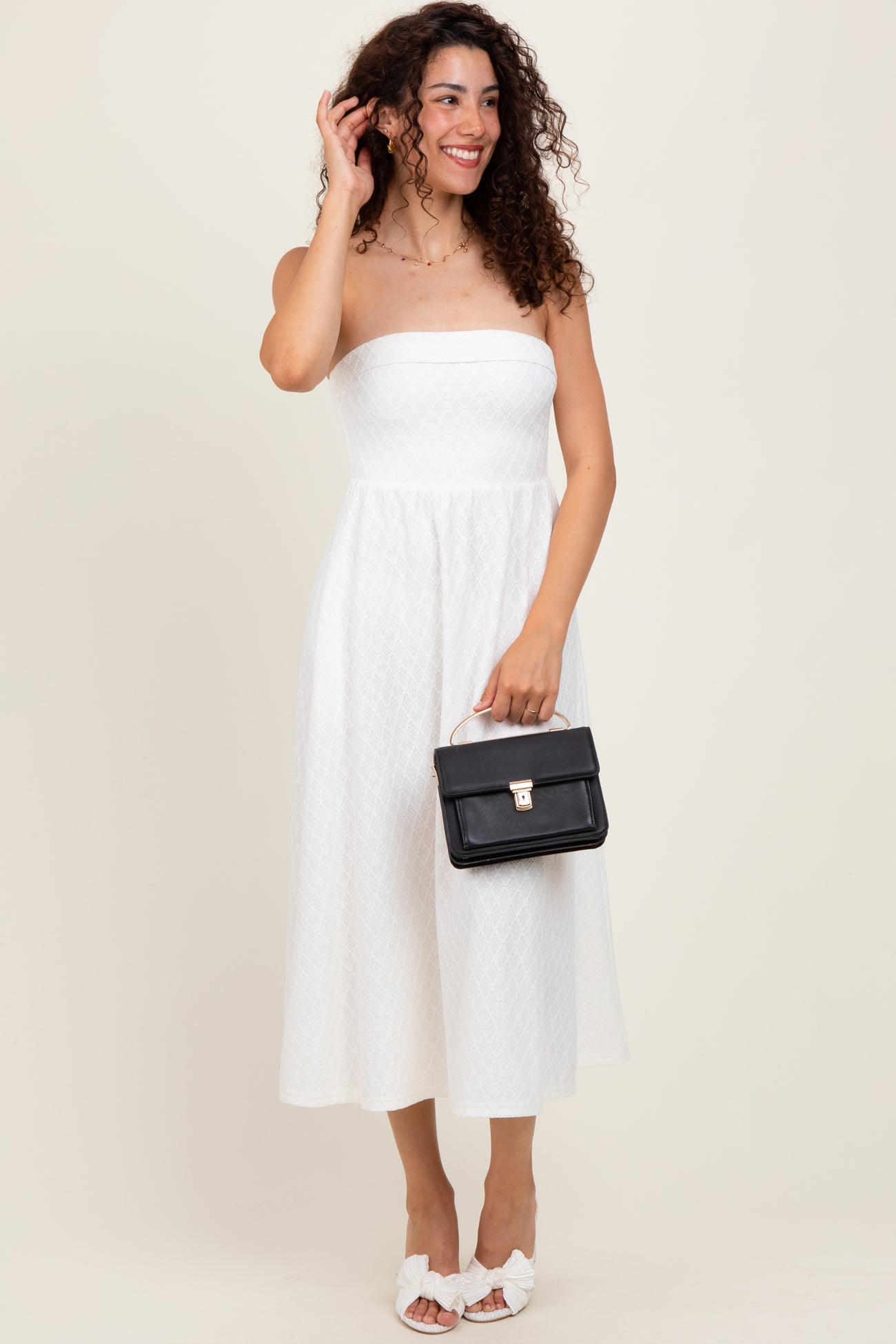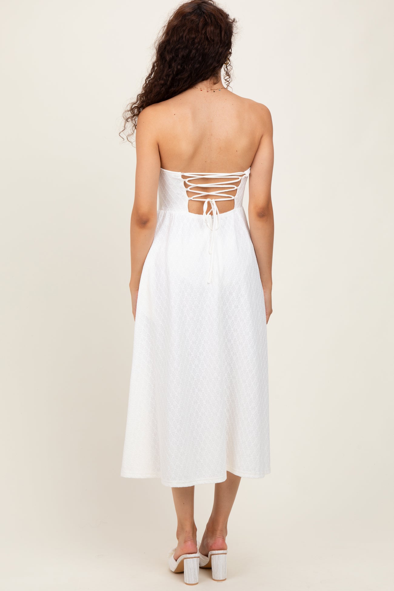 Ivory Lace Strapless Lace Up Back Midi Dress