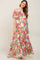 A printed maxi dress with a tiered skirt and off shoulder flounce top. Sash tie. Double lined.
