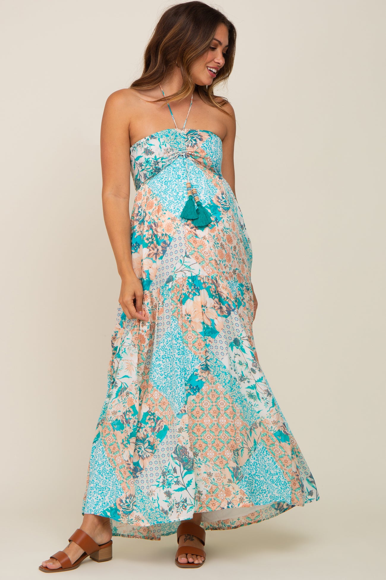Jade Floral Halter Front Tie Maternity Maxi Dress