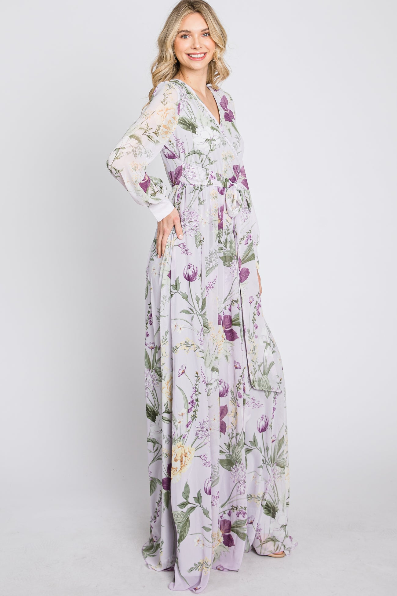 Lavender Floral Chiffon Long Sleeve Pleated Maxi Dress