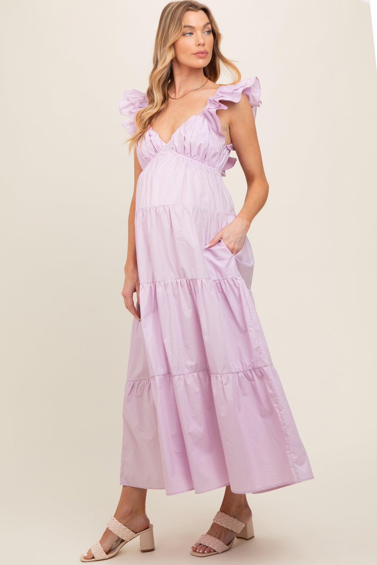 Lavender Flutter Sleeve Tiered Maternity Maxi Dress