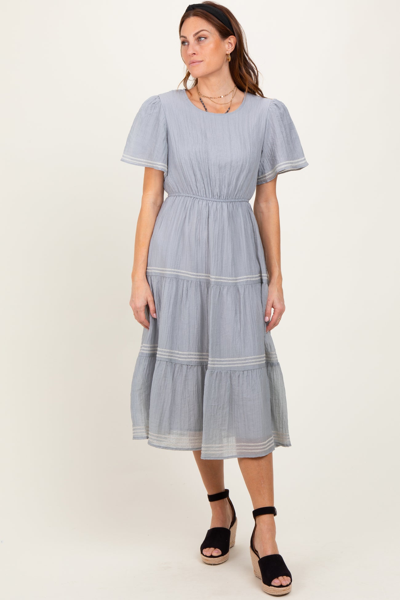 Light Blue Embroidered Tiered Midi Dress