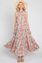 A floral maternity midi dress featuring a squared neckline, shirt cap sleeves, side pockets, a lined bust, a back cutout with a tie, an elastic back waist, and a hi-lo hem. May be worn backwards.