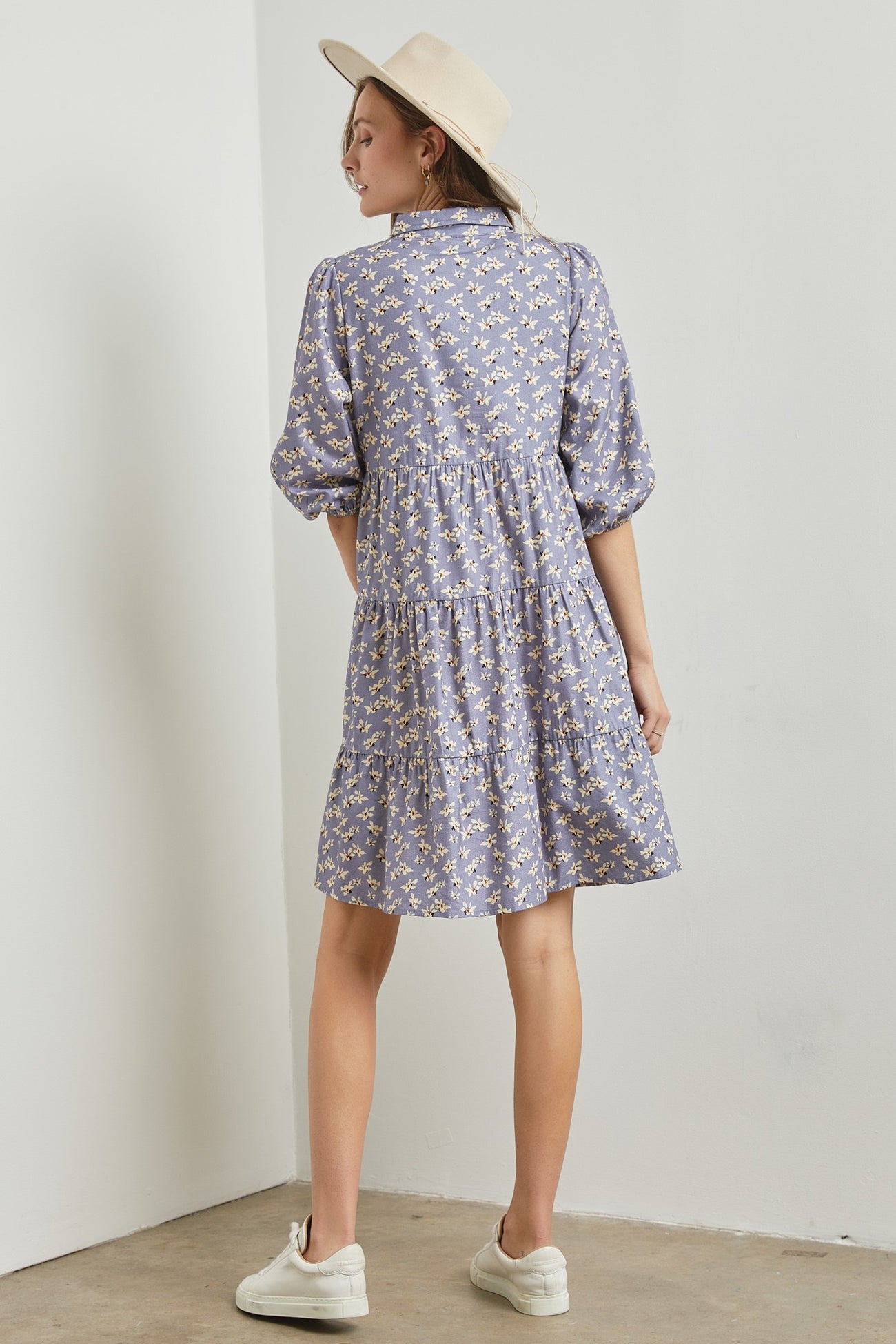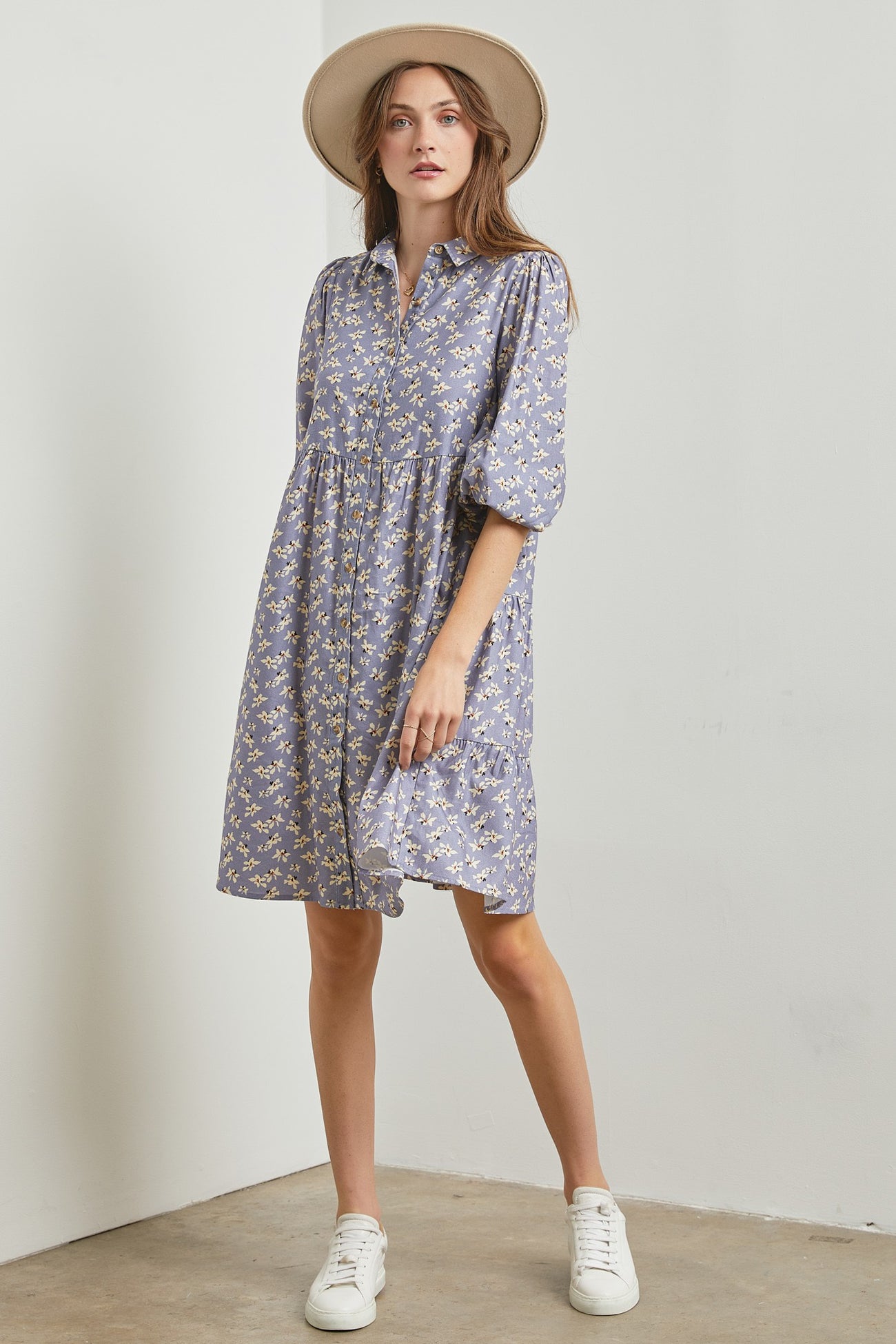 Light Blue Floral Button Front 3/4 Sleeve Dress