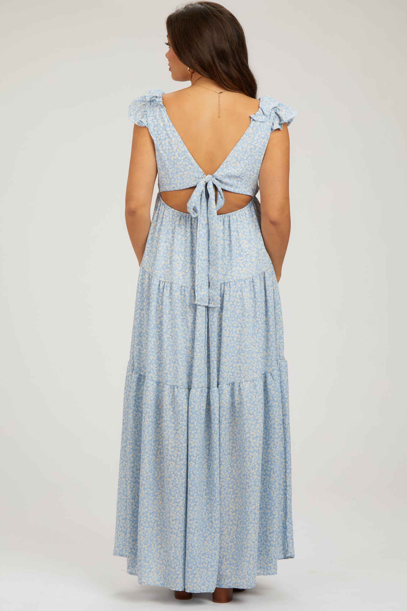 A floral maternity maxi dress with a deep v-neckline, capped ruffle sleeves, a tied back tie, an open back, and a tiered skirt. Dress is partially lined.
