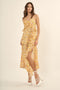 A floral embroidered maternity dress featuring short puff sleeves, a smocked self-tie back, a ruffle hem and a square neckline. Double lined.