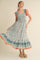 A floral midi dress featuring a ruffle accent squared neckline, a smocked top, flutter cap sleeves, a ruffle accent at the waist, side pockets, and a gathered bottom tier. Dress is fully lined.