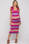 An open knit crochet maternity dress featuring adjustable straps and a scoop neckline. Dress is lined.